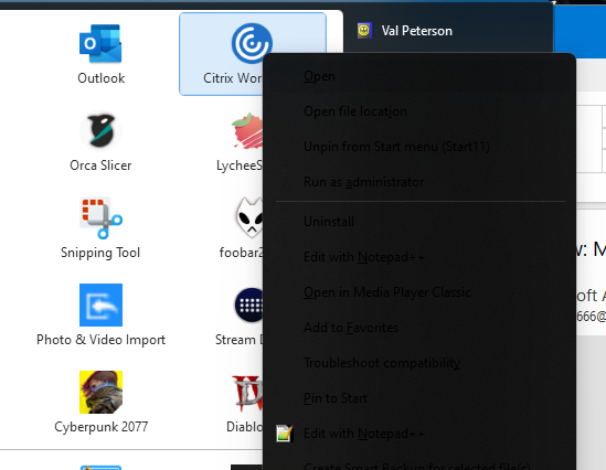 As you can see this renders the context menus illegible. Explorer windows, desktop icons and the like are fine, it seems to be context menus from the Start 11 Start menu specifically. But I cannot find out what this item is in the Skin Studio nor in Windowblinds to change the background, or the text for that matter, to make it so I can use these menus. If I go to the Windows regular Start menu I get a different element. If I disable Windowblinds I still get this problem.