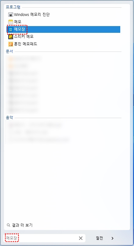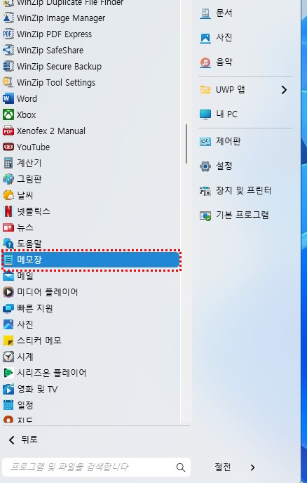 1) 메모장 in start menu