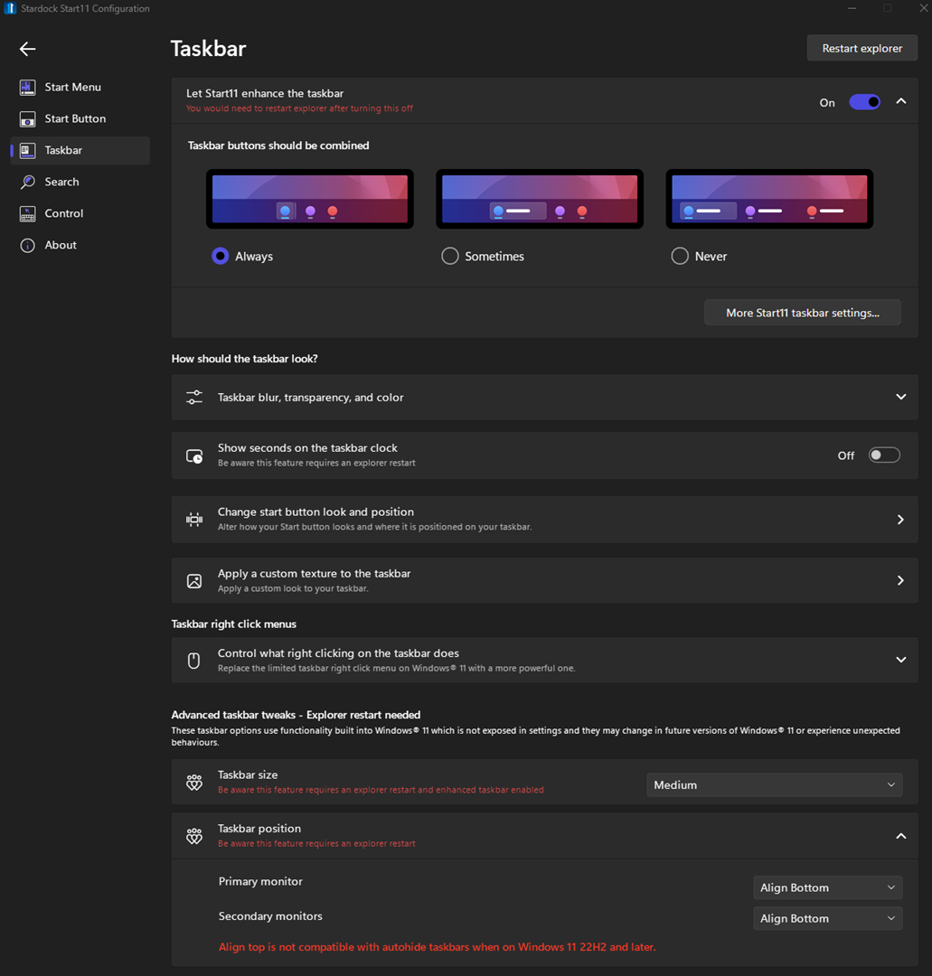 After a few times, my taskbar buttons are no longer combined. It will sometimes reactivate the custom start button when it was previously disabled after restarting the explorer. But I will see a double start menu after 2-3 toggles. Typically, when this problem arises and a reboot does not resolve it, I deactivate the enhanced taskbar, restart the explorer, restart the PC, reactivate the enhanced taskbar, and reboot again; this procedure usually resolves the issue of the double start menu for some time. It's just frustrating that this problem has been happening for a few months now.