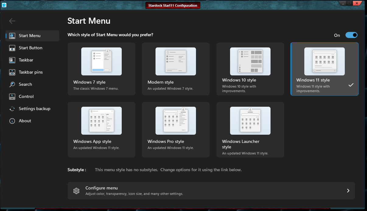 Easy way to tell, right click on the menu, does the menu have configure Start11 on it.