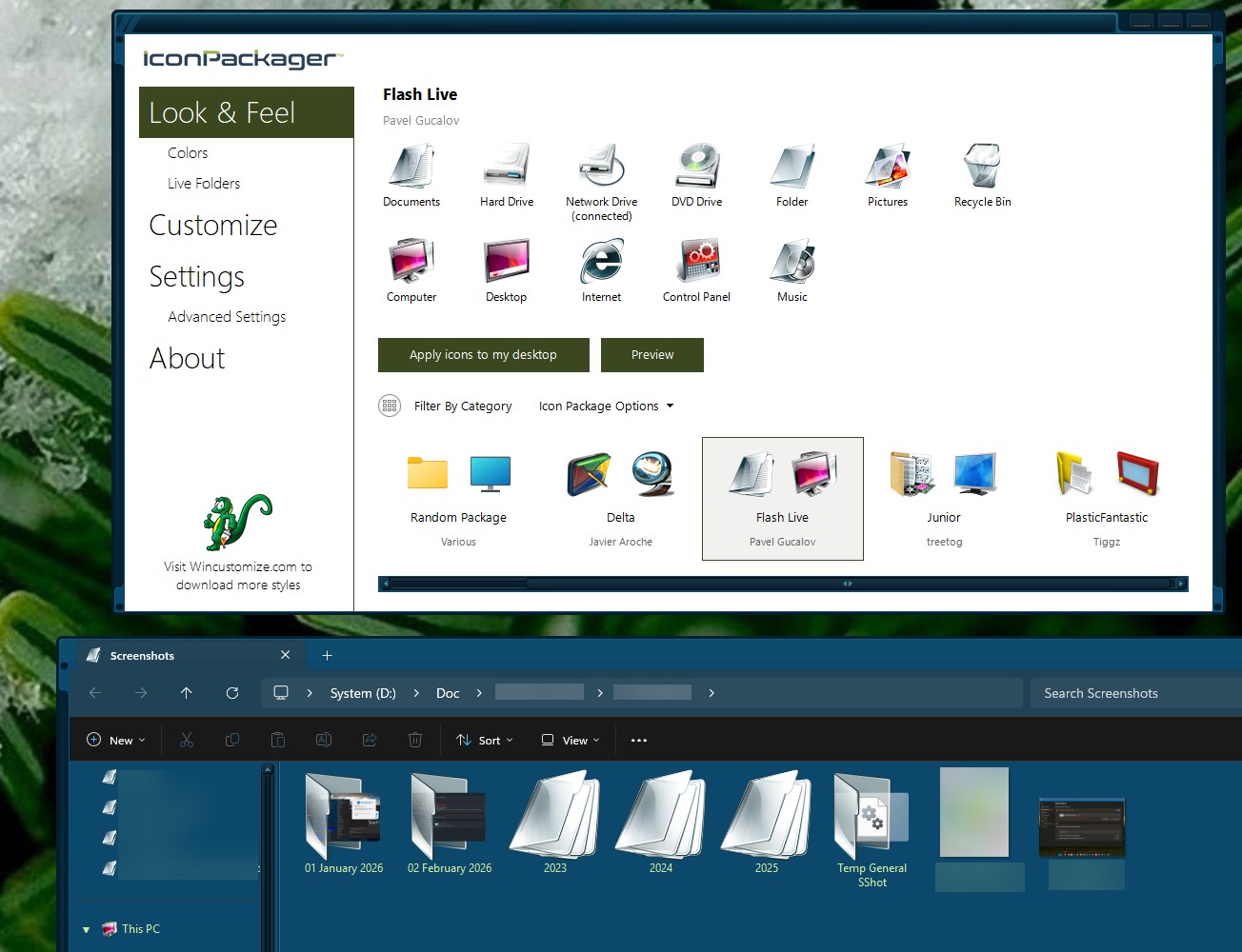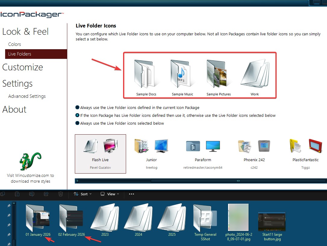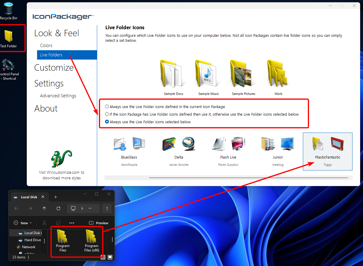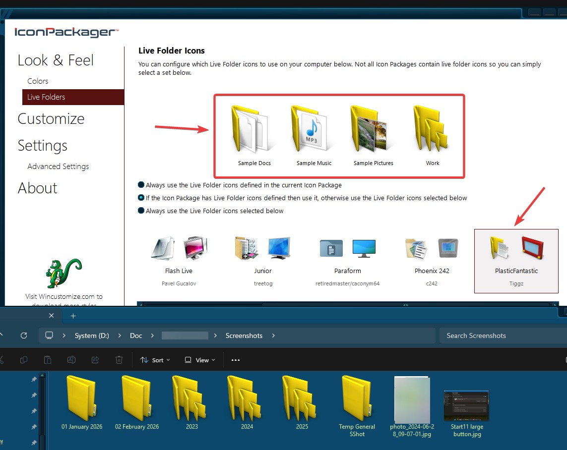 In the above picture, note that I have "Always use the Live Folder icons selected below" selected. If either of the other options here is selected, the package applied from the "Look & Feel" tab will overrule any "Live Folders" package when you apply it.